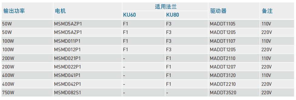 单轴机器人:常用电机参考(KU系列) 三菱 松下 Panasonic伺服电机