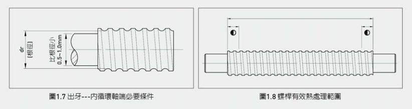 - 若您选用内循环或端盖式循环的滚珠螺杆,则其一端螺纹必须出牙且肩部最大尺寸,必须小于根径0.5~1.0mm,若要求肩部尺寸大于根径亦可,但将有螺纹线留于肩部上便于螺帽装入。如图1.7。