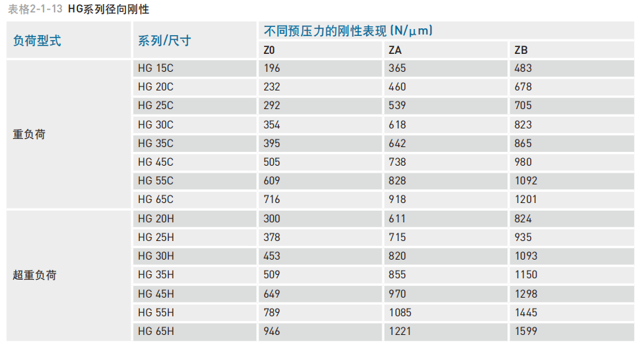 不同的预压力呈现不一样的滑块刚性,下表为各尺寸的滑块刚性值。