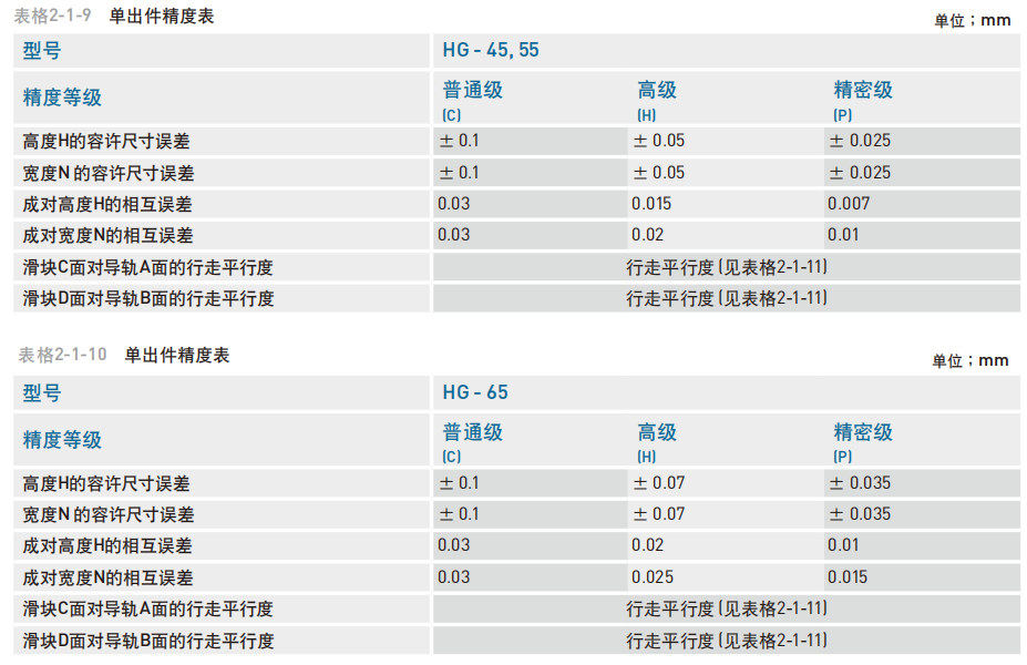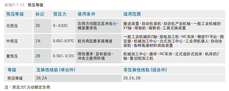 HG 系列直线导轨提供三种标准预压,可依据用途选择适当预压力。