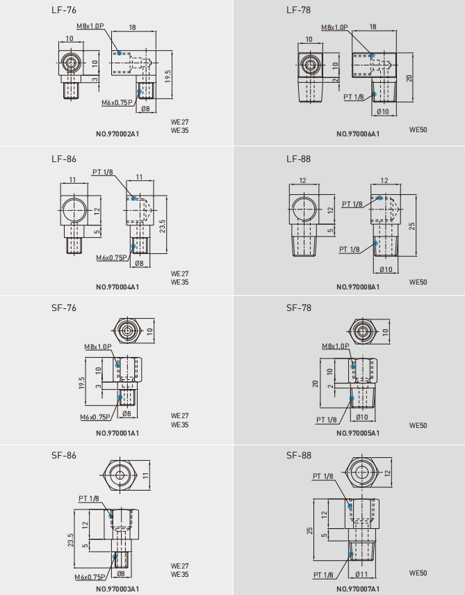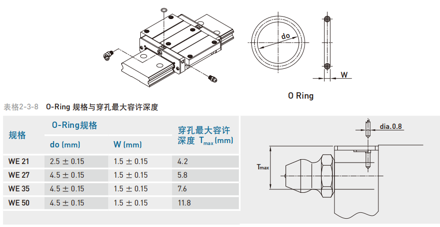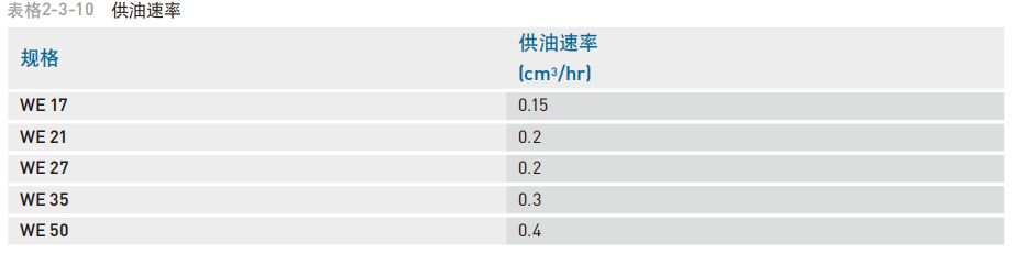 依客户需要在滑块前端或后端装上油嘴以供手动打油,WE系列特别在端盖侧边预留侧油孔位置安装油嘴(一般为直油嘴),提供侧向打油,侧向打油的位置建议在非侧基准边,但若有特殊需要亦可放在侧基准边。客户如有上述侧向打油需求请与我们联络。WE系列在端盖顶端亦预留上油孔位置,客户若欲从端盖上方供油,须使用直径0.8mm的金属针以预热的方式,在指定位置将上油孔穿通,再将密封环安装于凹处即可,避免使用钻头穿通上油孔,碎屑有污染油道的危险。使用接管方式自动供润滑油脂之直线导轨,则可依连接管型式选用安装油管接头。