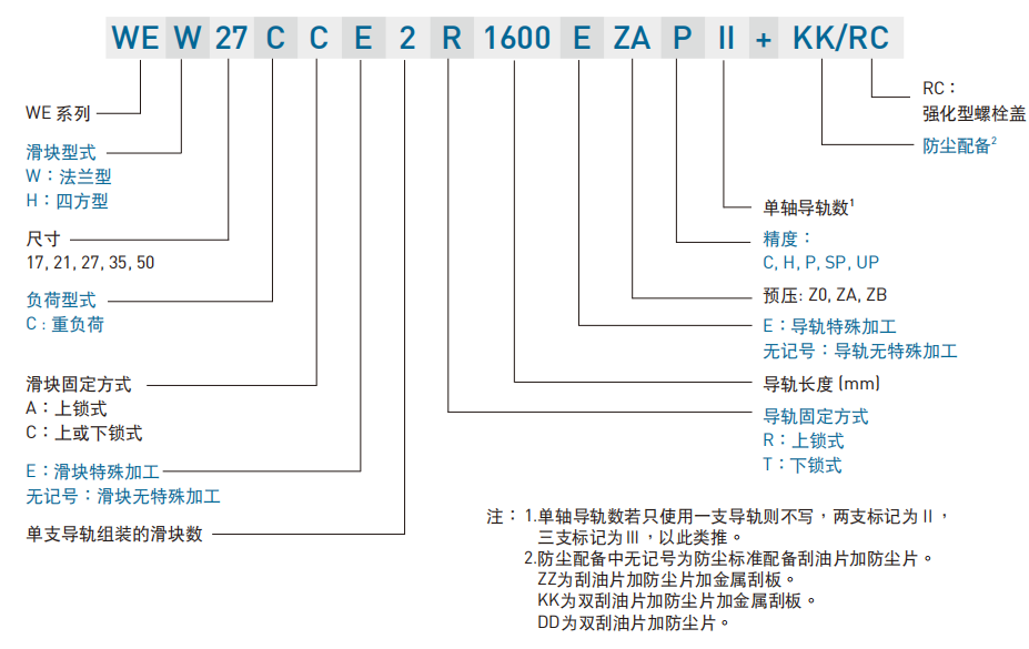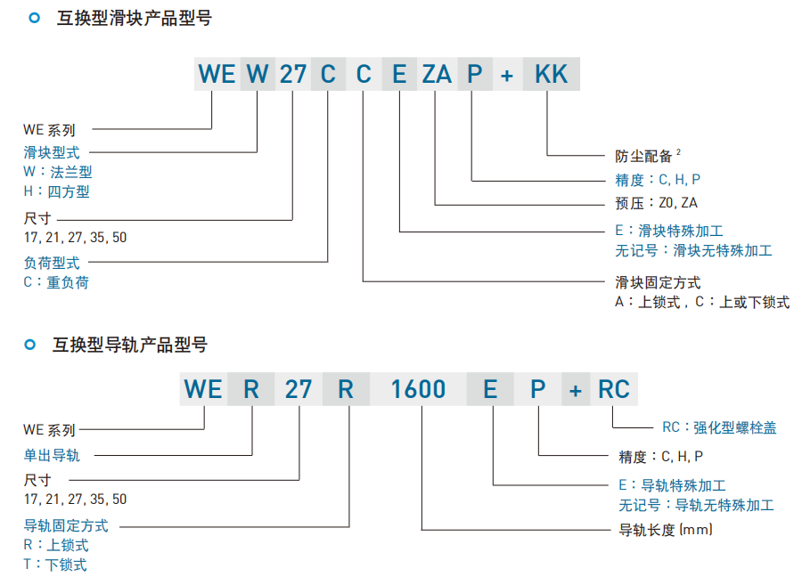 WE系列分为非互换性及互换性型两种直线导轨,两者规格尺寸相同,主要差异点在于互换性型之滑块、导轨可单独互换使用,较便利,但其组合精度无法达到非互换性型之超精密级以上的精度,不过由于HIWIN互换性型之组合精度目前已达到一定的水准,对不需配对安装直线导轨的客户而言,是一项便利的选择。直线导轨的产品规格型号主要标明直线导轨尺寸、型式、精度等级、预压等规格要求,以利订货时双方对产品的确认。