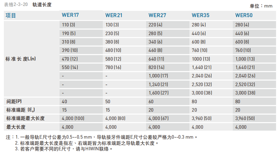 HIWIN备有导轨标准长度库存供应客户需求。若客户订购非标准长度导轨时,端面距离E的尺寸最好不要大于1/2P,防止因E的尺寸过大导致导轨装配后端部的不稳定,而降低直线导轨的精度。
